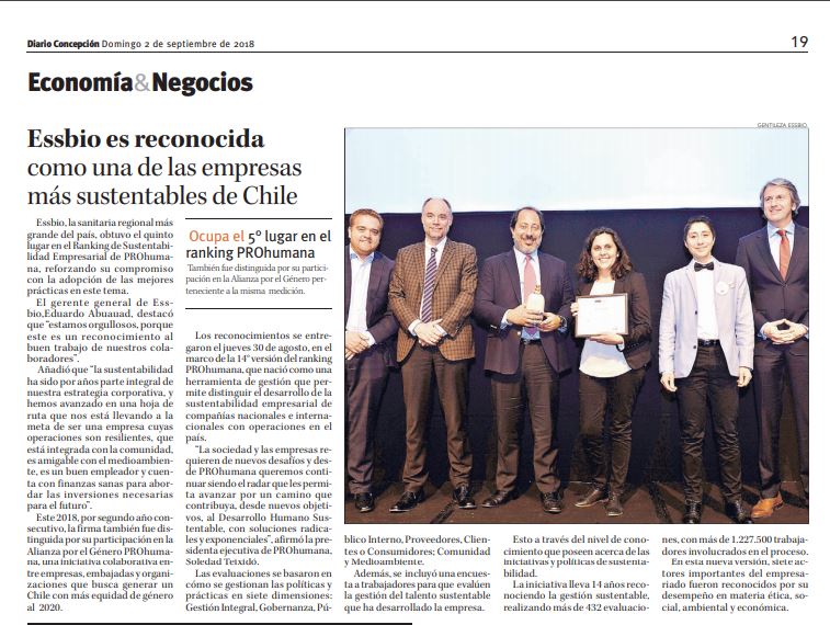 Essbio, la sanitaria mas grande del país, obtuvo el quinto lugar en el Ranking de Sustentabilidad Empresarial de PROhumana, reforzando su compromiso con la adopción de las mejores prácticas en este tema.