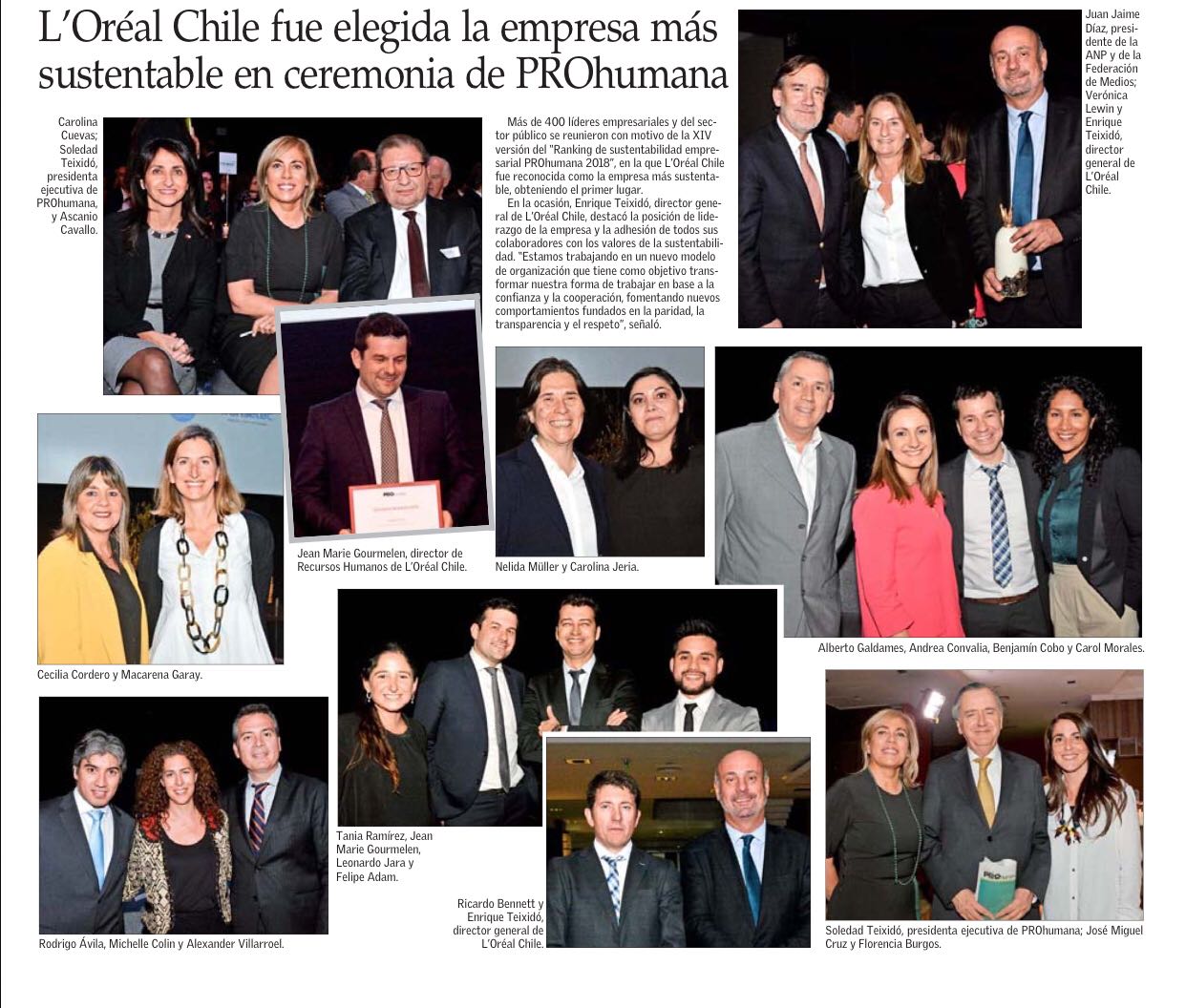 Más de 400 líderes empresariales y del sector público se reunieron con motivo de la XIV versión del “Ranking de sustentabilidad empresarial PROhumana 2018”, en la que L´Oréal Chile fue reconocida como la empresa mas sustentable, obteniendo el primer lugar.
