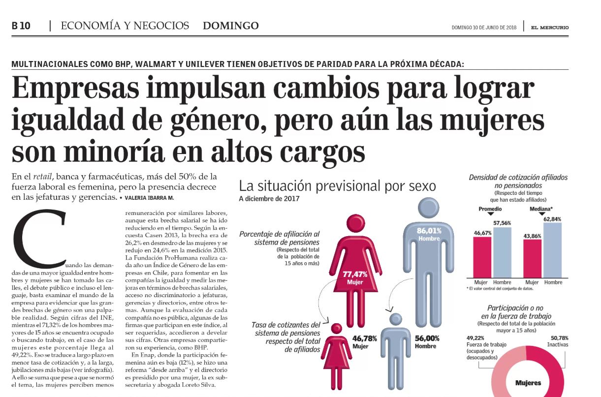 La Fundación ProHumana realiza cada año un Índice de Género de las empresas en Chile, para fomentar en las compañías la igualdad y medir las mejoras en términos de brechas salariales, acceso no discriminatorio a jefaturas, gerencias y directorios, entre otros temas. Aunque la evaluación de cada compañía no es pública, algunas de las firmas que participan en este índice, al ser requeridas, accedieron a develar sus cifras. |
