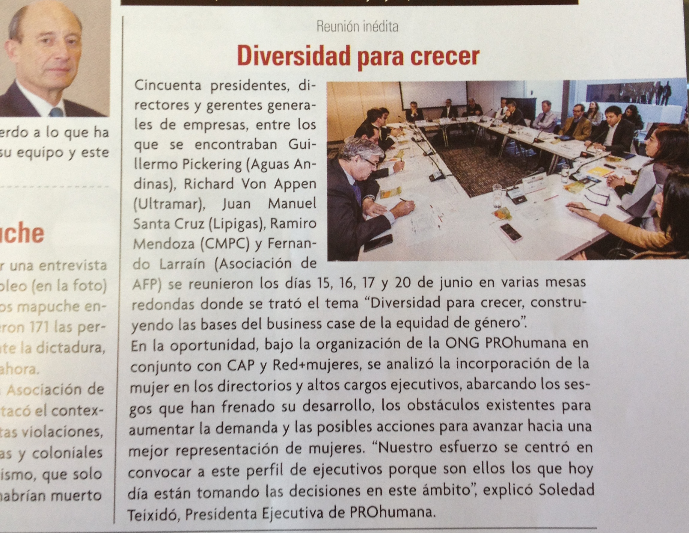 Cincuenta presidentes, directores y gerentes generales de empresas, entre los que se encontraban Guillermo Pickering (Aguas Andinas), Richard Von Appen (Ultramar), Juan Manuel Santa Cruz (Lipigas), Ramiro Mendoza (CMPC) y Fernando Larraín (Asociación de AFP) se reunieron los días 15, 16, 17 y 20 de junio en varias mesas redondas donde se trató el tema “Diversidad para crecer, construyendo las bases del business case de la equidad de género”. |