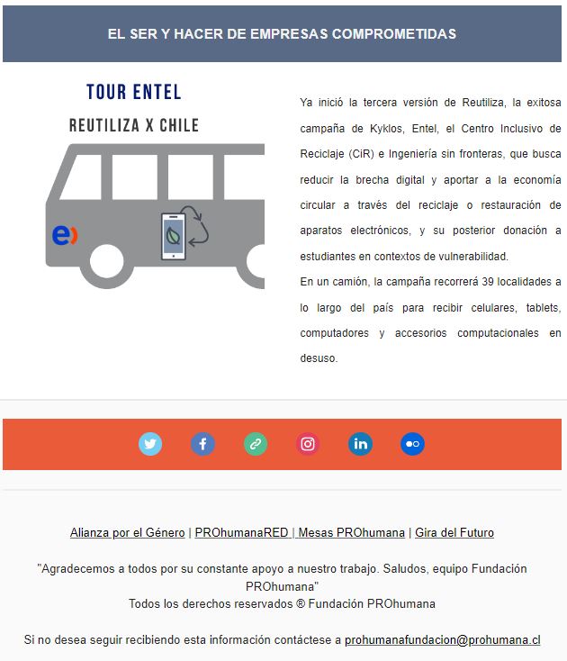 Starting with this statement, we contribute to the creation of networks with people and institutions to participate, cooperate and sustain the promotion of corporate social responsibility in the country. That is why we are the founders, coordinators and leaders of the PROhumana Network. An initiative created in 2006, with the need from companies and organizations to get together in the issues of sustainability, and that way is able to implement sustainability in their companies and generate collaborations, knowledge, interactions and cooperation between organizations.