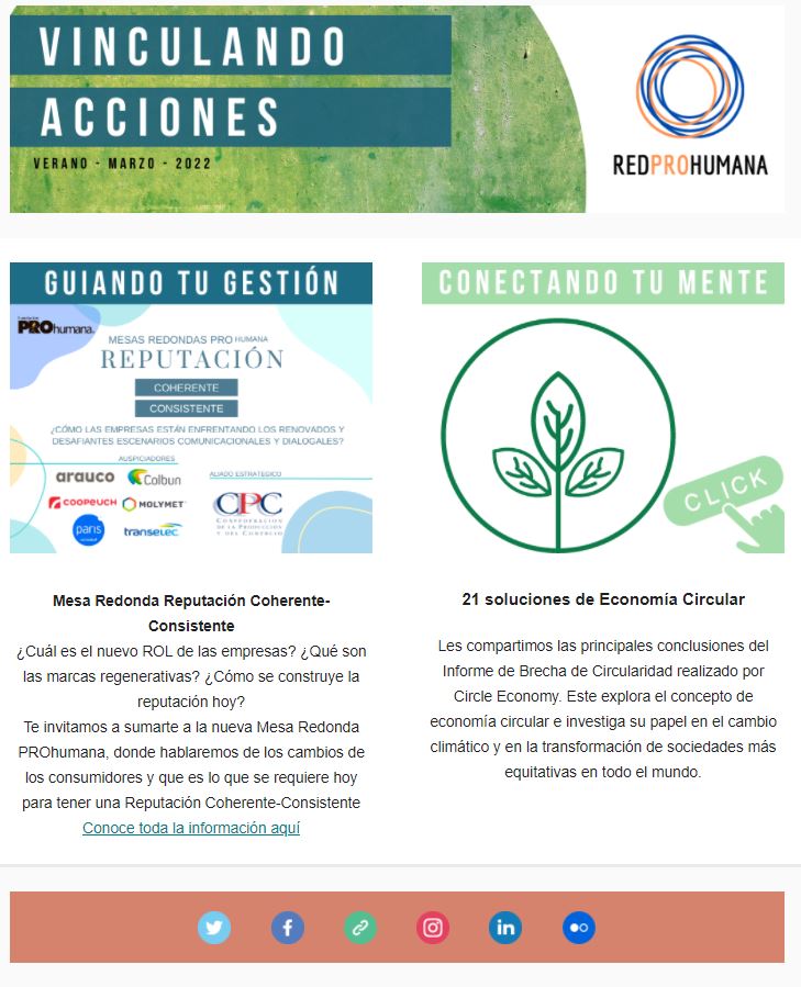 Starting with this statement, we contribute to the creation of networks with people and institutions to participate, cooperate and sustain the promotion of corporate social responsibility in the country. That is why we are the founders, coordinators and leaders of the PROhumana Network. An initiative created in 2006, with the need from companies and organizations to get together in the issues of sustainability, and that way is able to implement sustainability in their companies and generate collaborations, knowledge, interactions and cooperation between organizations.