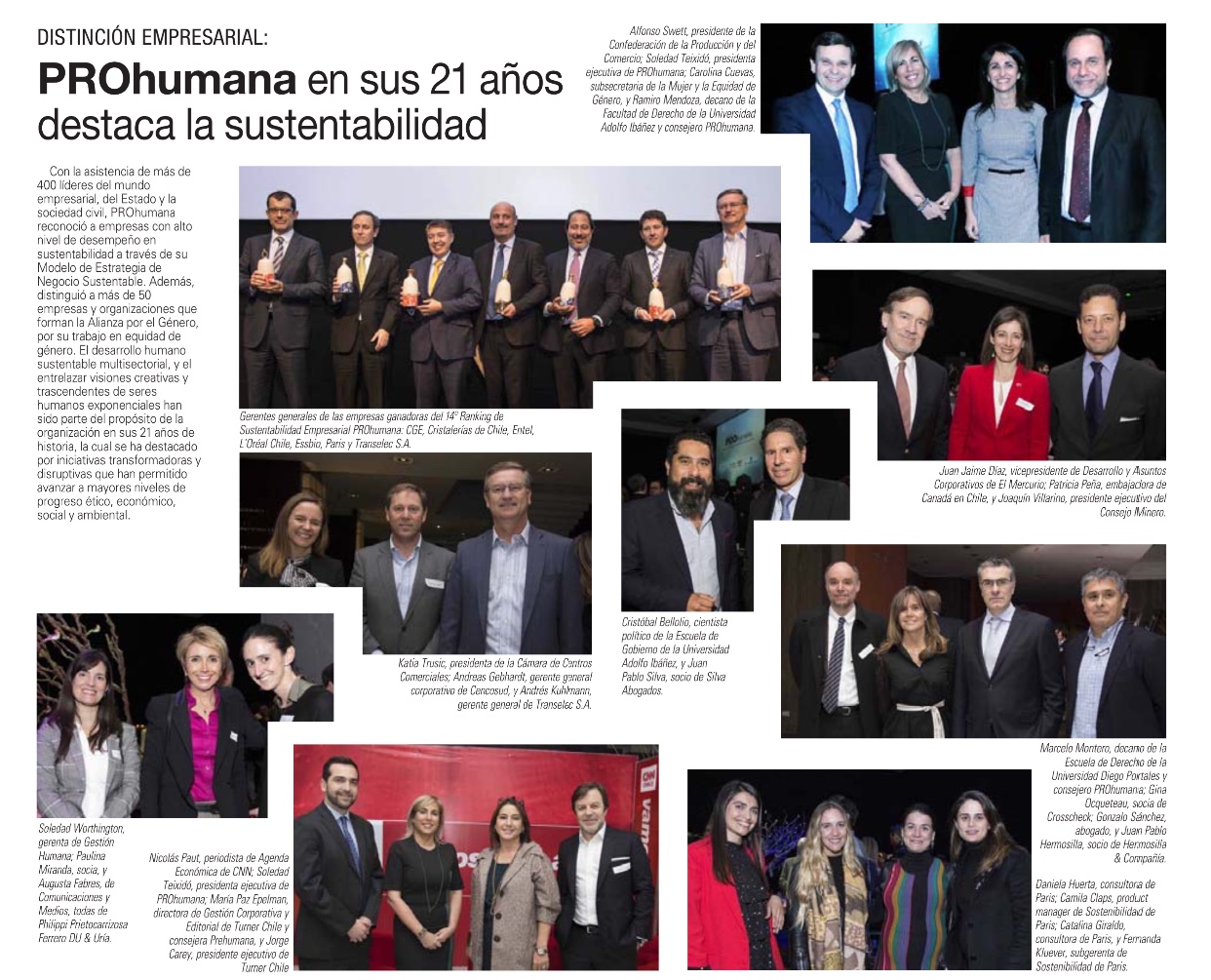 Con la asistencia de más de 400 líderes del mundo empresarial, del Estado y la sociedad civil, PROhumana reconoció a empresas con alto nivel de desempeño en sustentabilidad a través de su Modelo de Estrategia de Negocio Sustentable.
