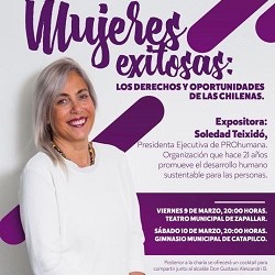 Dentro del programa de celebración del Día Internacional de la Mujer, destacaron las charlas por los derechos de las mujeres que se realizaron en Zapallar y Catapilco dictadas por la reconocida conferencista y Presidenta Ejecutiva de Fundación PROhumana, Soledad Teixidó. En el encuentro se habló sobre los derechos de las mujeres, entregando herramientas para empoderarlas y así avanzar hacia la equidad de género en Chile, con el objetivo de desestigmatizar roles y compartir tareas cotidianas entre hombres y mujeres. Abordó además este tema a través de la cercanía, simplicidad y naturalidad, que muchas veces es desconocido y/o prejuiciado por la sociedad, pero que cada vez toma relevancia en nuestro país y el mundo. “Desde la municipalidad de Zapallar, preparamos una ‘Semana de la Mujer’ que contempla diversas actividades donde buscamos contribuir en diversos ámbitos al crecimiento personal y familiar de nuestras vecinas”, así lo destacó el alcalde de Zapallar Gustavo Alessandri.